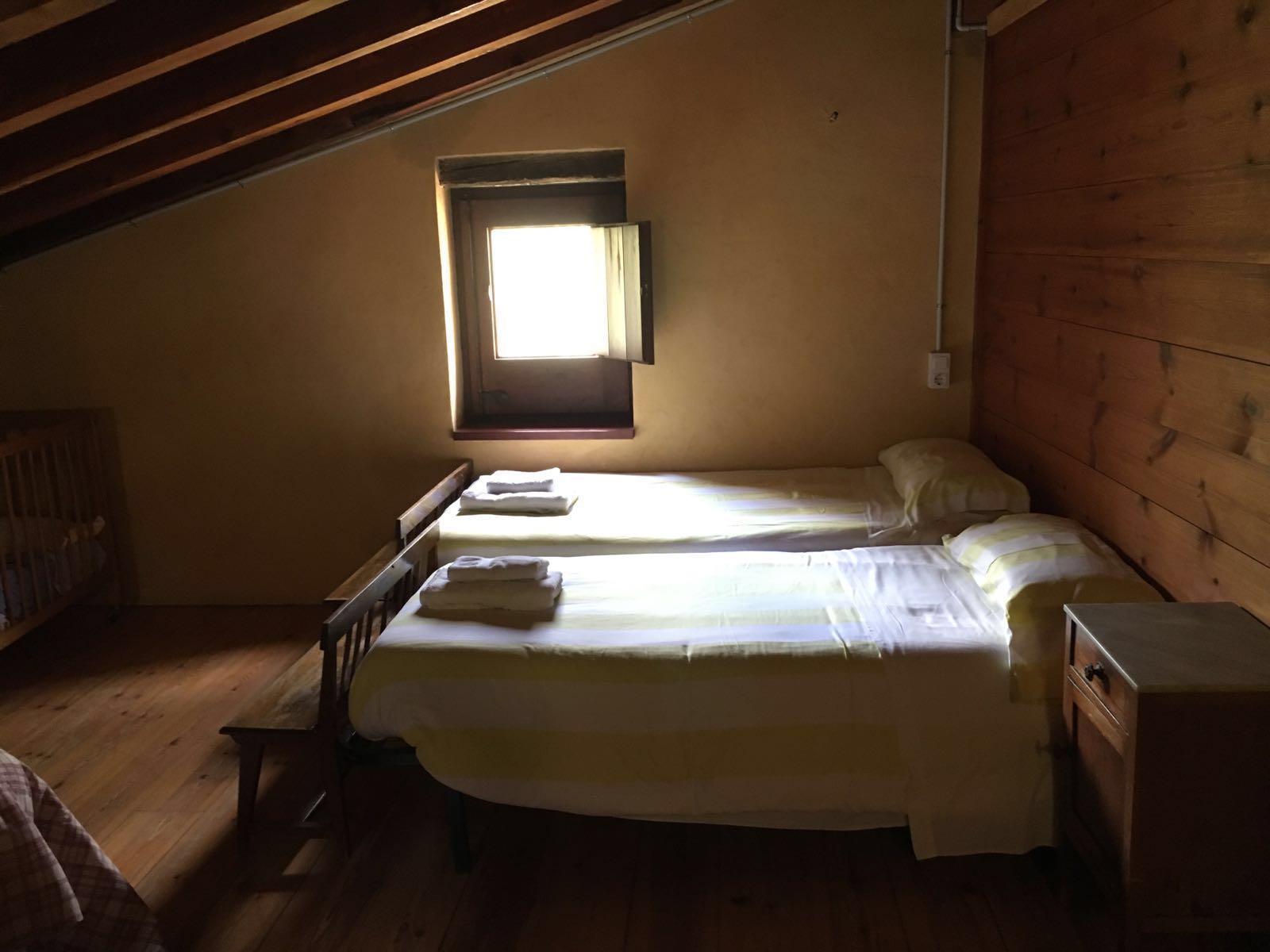 At the top floor, there is a triple-room with a double-bed and an individual one, and a big room with two individual beds where you can enjoy a wide area to play with the children.